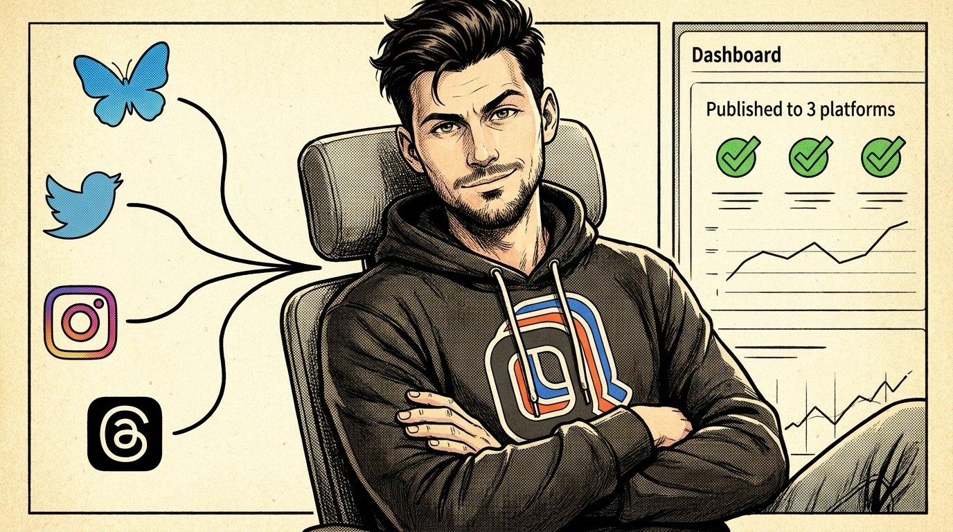 Write your post once, attach media, and publish to Bluesky, Twitter, Instagram, Facebook, LinkedIn, Threads, TikTok, and YouTube from one API call. PublishQ takes care of rich text detection, image dimension extraction, video preprocessing, and per-platform formatting.